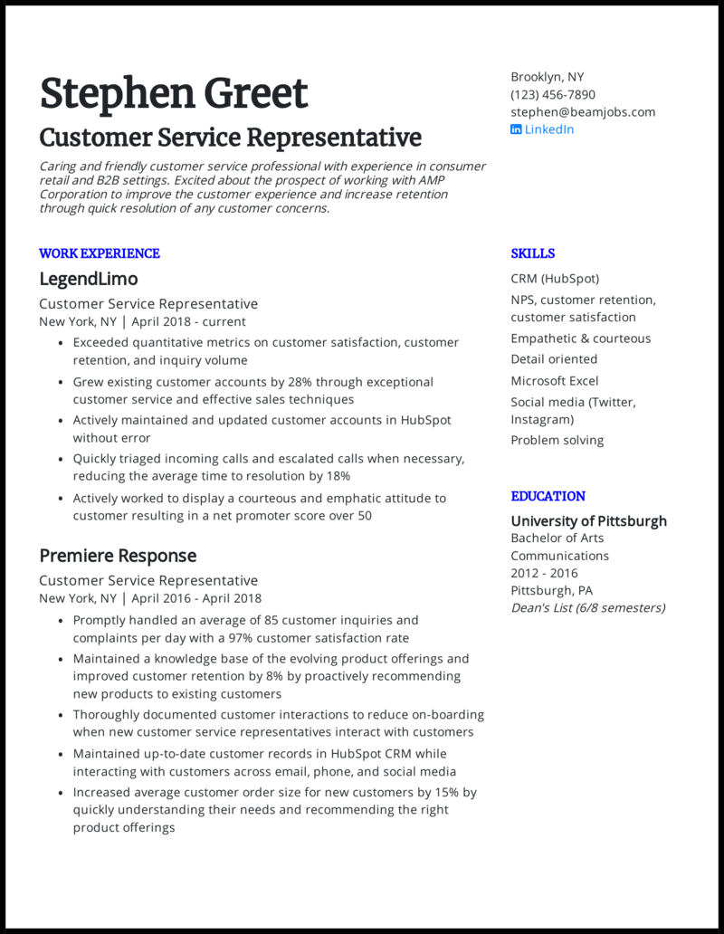 Customer Service Representative Resume Example A proven job specific resume sample for landing your next job in 2021. And evaluating information to determine compliance with standards. Customer service is an essential aspect of any organization be it a small online shop or a booming corporation.