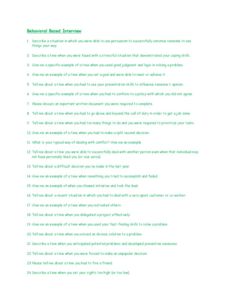 An example of a behavioral interview question is How have you motivated others. They took up positions about every 50 feet and helped me stretch. Give me an example of a time when you used deductive reasoning skills to solve a problem.