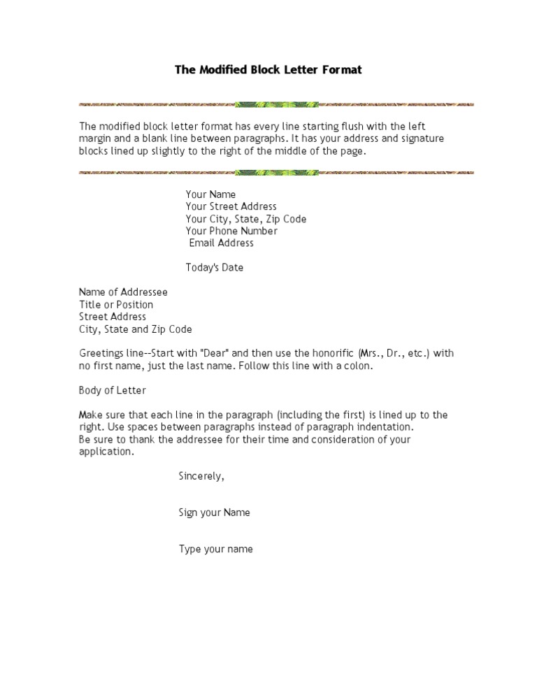 The common block letter format has all of the text flush with the left margin. Rules with Samples Full Block. In this type the body of the letter and the senders and recipients addresses are left justified and single-spaced.